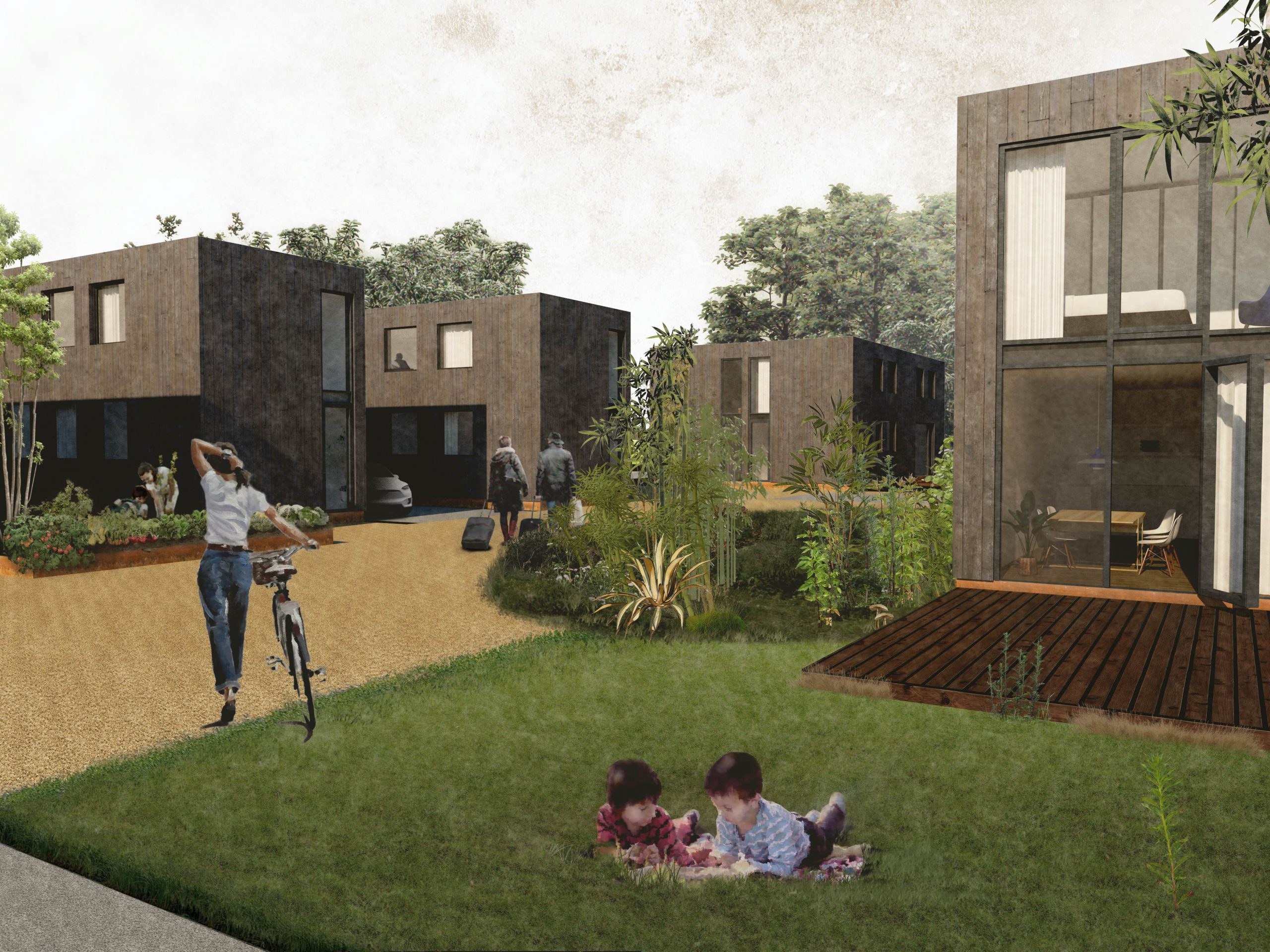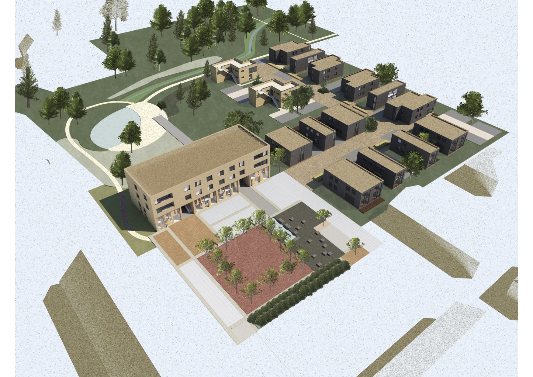 2019 entstand die Idee der Planer auf dem 11.400 m2 großen Grundstück einen Wohnstandort zu entwickeln der sich gut in die dörfliche und naturnahe Umgebung einpasst, sowohl in städtebaulicher als auch in architektonischer Hinsicht.